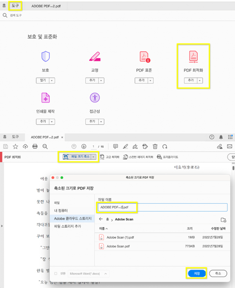 - 어도비 애크로뱃 프로 실행 > [도구] > [PDF 최적화]