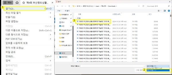 - 메뉴 > ‘열기’ 클릭 > ‘파일’ 더블 클릭