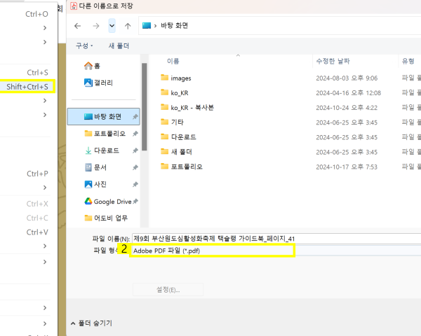 - 파일 형식 > ‘Adobe PDF 파일(*.PDF)’ 클릭