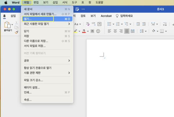 1. Microsoft Word 실행 > [파일] > [열기] 선택