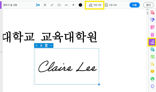 1. [채우기 및 서명] 메뉴 클릭 > [직접 서명] 클릭 > 서명 입력