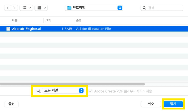 2. 파일 표시 필터 [모든 파일]로 설정 > Ai파일 선택 > [열기] 클릭
