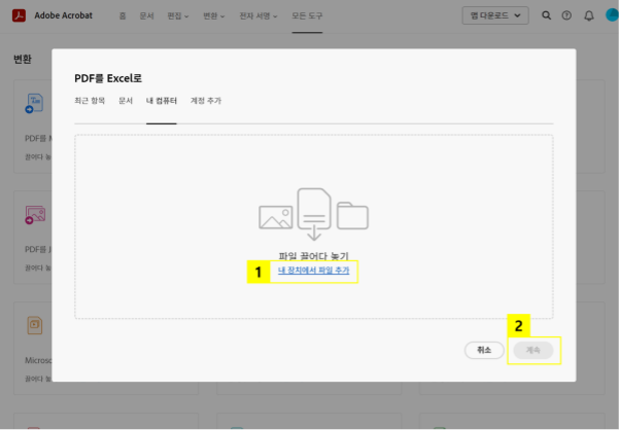 PDF를 Excel로 도구에서 파일 추가하기