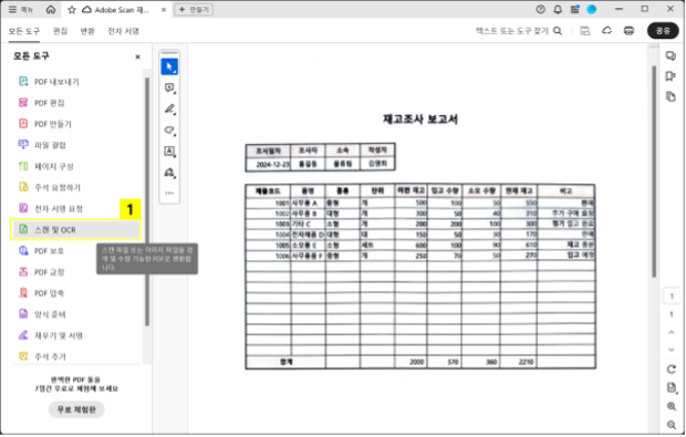 애크로뱃 프로그램에서 스캔한 PDF 파일 열고 스캔 및 OCR 도구 클릭하기