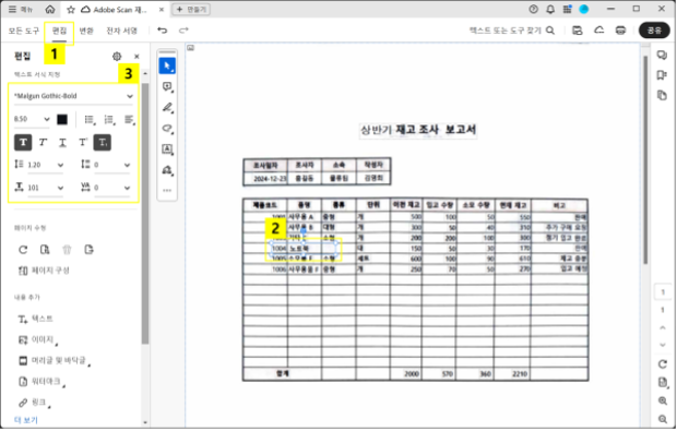 이렇게 만든 PDF 파일은 애크로뱃 프로그램에서 바로 편집할 수 있습니다. 텍스트나 표의 내용을 수정하거나 추가 작업이 필요한 경우, 애크로뱃의 PDF 무료 변환 등 편집 기능을 통해 쉽게 변경할 수 있죠. 디지털화된 문서를 손쉽게 관리하고, 필요한 부분을 즉시 수정하여 업무 처리 속도를 높여보세요.