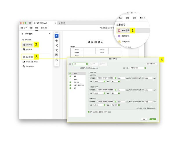 대용량 파일 전송 시 PDF 압축 기능을 활용해 파일 용량을 줄일 수 있습니다. 전달 목적에 따라 품질과 압축률을 설정할 수 있으며, 압축 후에도 이미지 품질을 최대한으로 유지할 수 있다는 장점이 있죠. 애크로뱃 PDF 압축 기능을 통해 전송 속도와 효율성을 향상시켜 보세요.