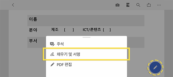 - 우측 도구 아이콘 클릭 > [채우기 및 서명] 클릭