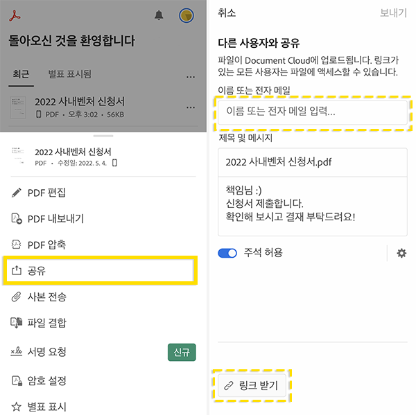 마지막으로 다른 사용자에게 공유까지 애크로뱃 앱에서 링크 생성해 공개적으로 공유하거나 또는 특정 사용자만 권한을 추가하는 방식으로 진행해 보세요.