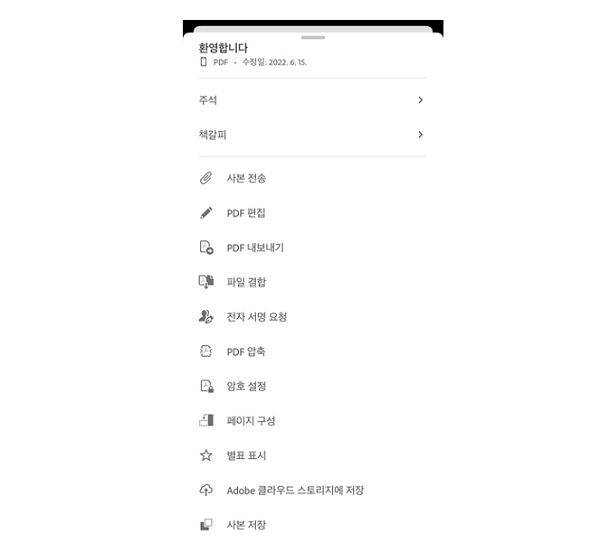 어도비 애크로뱃 모바일(Adobe Acrobat Mobile)에서 리퀴드 모드 적용 후, 다양한 PDF 편집 기능까지 함께 이용해 보세요. PDF 파일 열람 후, 우측 상단의 점 세 개 버튼을 누르면 주석과 책갈피 추가, 페이지 구성 등 다양한 편집 기능을 확인할 수 있습니다.