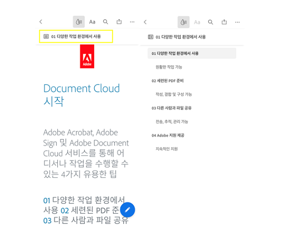 PDF 파일을 열어준 뒤 어도비 리퀴드 모드를 실행하면 상단에 [목차 보기]가 있습니다. [목차 보기]를 선택하면 해당 모바일 PDF 파일의 목차가 생성되어 있는 것을 확인할 수 있고, 각 목차를 선택하면 해당 섹션으로 바로 이동할 수 있습니다.