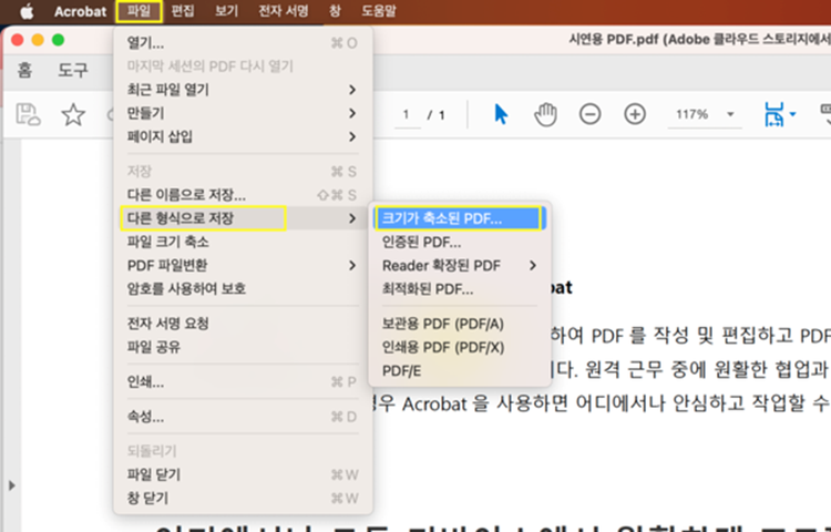 - [파일] > [다른 형식으로 저장] > [크기가 축소된 PDF] 선택