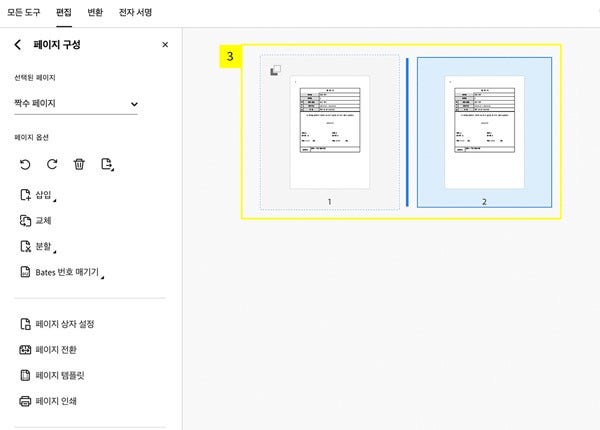 - 어도비 애크로뱃에 워드 파일 업로드 > [모든 도구] > [페이지 구성]을 선택하여 페이지 편집 모드로 진입