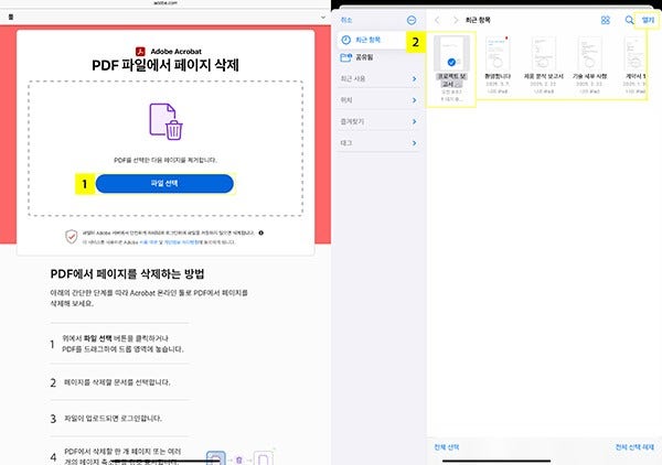 - 애크로뱃 온라인 PDF 페이지 삭제 사이트에서 ‘파일 선택’ 선택