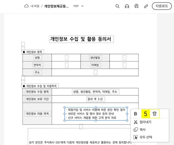 애크로뱃 PDF 편집 사이트에서 개인정보동의서 양식을 열면 손쉽게 텍스트를 수정할 수 있습니다. 위에서 언급한 유의사항을 참고해 최대한 구체적으로 개인정보 수집 목적을 기재하는 것이 좋습니다. 회사 상황에 맞게 양식을 수정해 보세요.