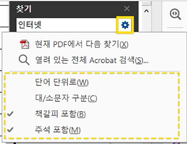 PDF 단어 검색창의 설정 옵션도 살펴보세요. 더 효율적인 검색을 위해 검색 범위를 제한할 수 있습니다. 애크로뱃으로 PDF 필기한 내용들까지 놓치지 않고 찾아보고 싶을 때는 ‘주석 포함’ 여부에 체크하세요. 영어 단어를 검색할 때는 대소문자까지 명확하게 일치하는 텍스트만 걸러낼 수 있도록 선택할 수 있습니다.