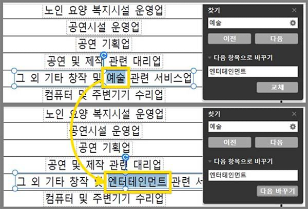 먼저 교정하고 싶은 단어를 검색한 후, 검색창의 ‘다음 항목으로 바꾸기'를 클릭한 뒤, 변경하고 싶은 단어를 입력하면 검색했던 단어가 새로운 단어로 교체됩니다.
