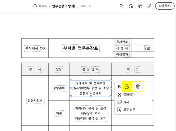 PDF 편집 사이트에서 업무분장표 양식을 열고 PDF 파일 수정해 보세요. 업무분장표 항목이나 내용을 원하는 대로 수정할 수 있습니다. 불필요한 내용을 빠르게 삭제할 수도 있죠.