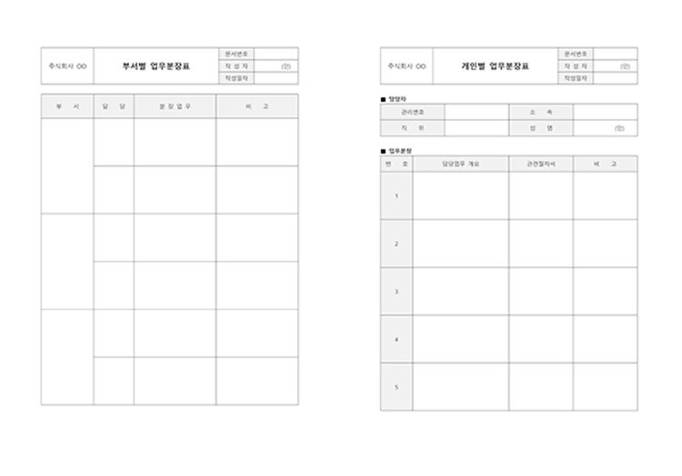업무분장표는 회사에서 업무를 나누어 분담한 내용을 작성한 표입니다. 부서 및 개인에 따라 수행할 업무를 자세히 구분하고, 이를 명시하기 위해 활용할 수 있습니다.