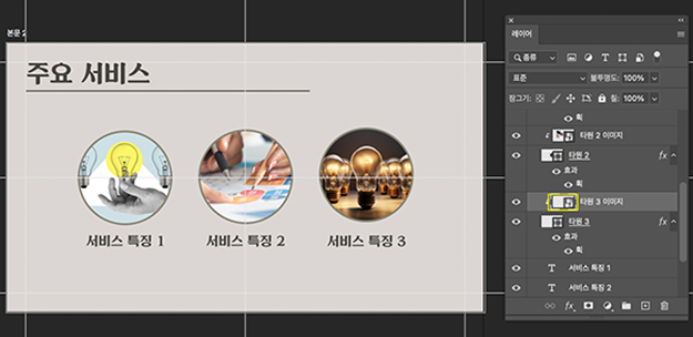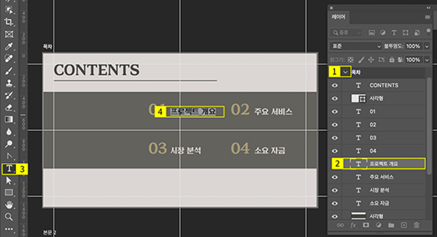 텍스트를 수정하고 싶다면 해당 대지의 그룹을 열고, 레이어를 확인해 보세요. 텍스트 내용과 레이어 이름은 동일하게 설정돼 있어요.