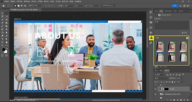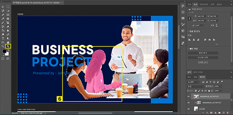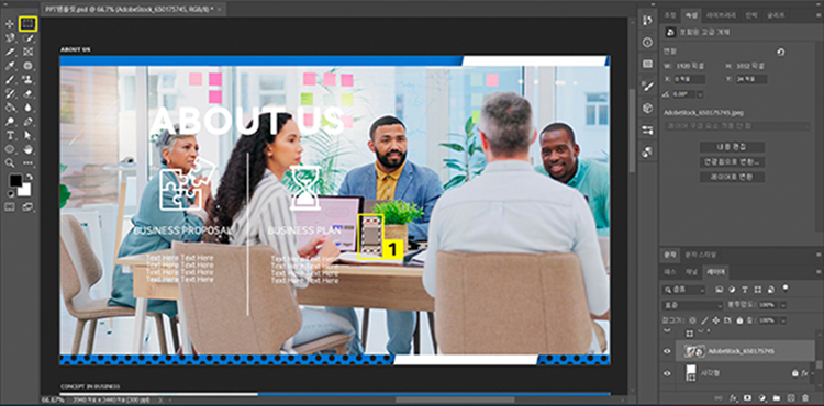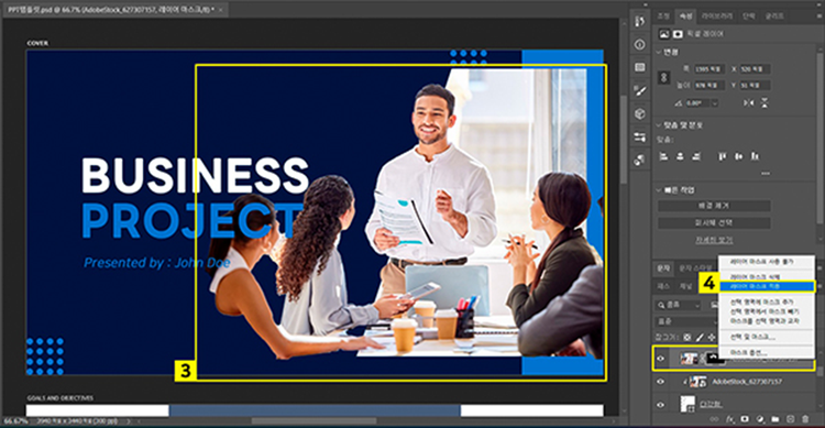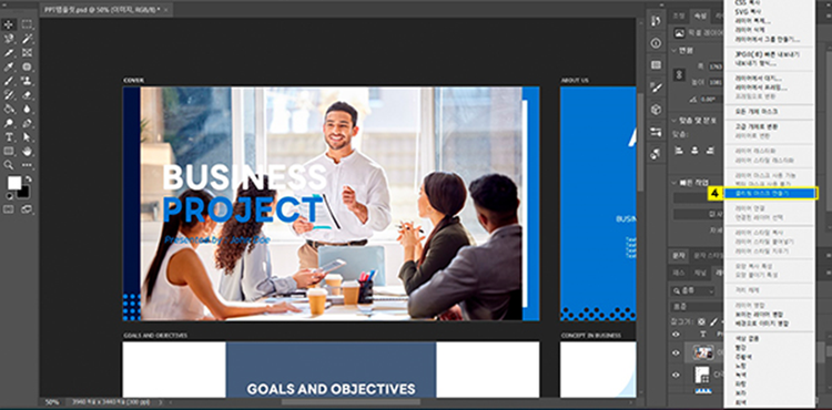- 조정 레이어 선택하여 활성화 > 속성 패널에서 채도 값 조정하여 파워포인트 템플릿의 COVER 페이지를 완성