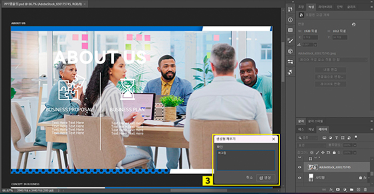프레젠테이션에 들어갈 이미지에 뭔가 부족하다고 느껴진다면, 포토샵의 AI 생성형 채우기 기능으로 이미지에 오브젝트를 추가해 줄 수 있는데요. 프레젠테이션 목적에 어울리는 사진을 연출해 내거나 허전하다고 느껴지는 부분을 채워줄 수 있습니다.