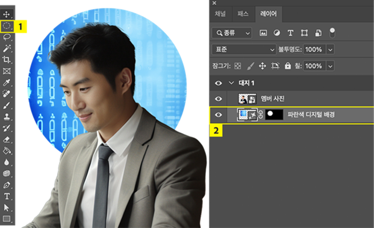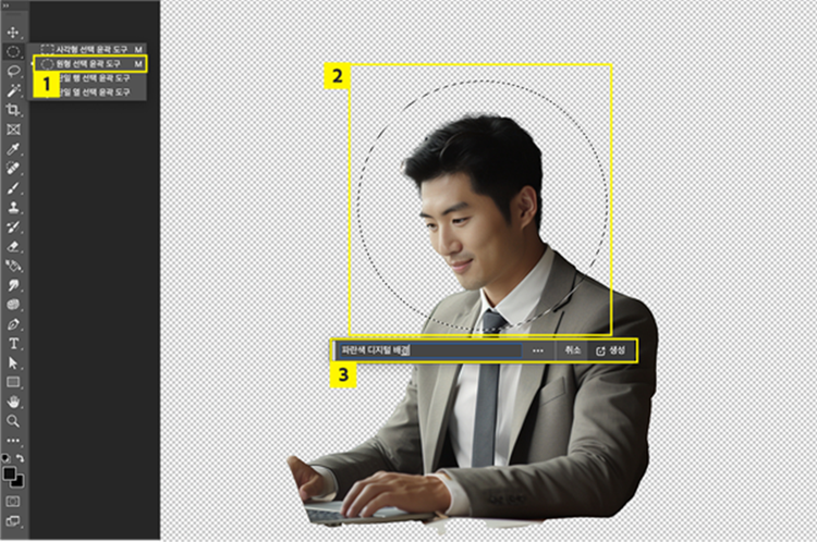 인물 사진의 배경을 제거하였다면, 다음은 배경을 추가해줄 차례입니다. 이때, 회사의 이미지와 적합한 배경 이미지를 따로 찾거나 촬영할 필요 없이 포토샵 생성형 AI를 활용한 생성형 채우기를 통해 배경을 생성할 수 있습니다. 생성형 채우기로 원형의 배경을 생성해보겠습니다.