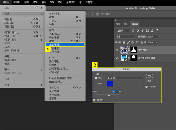 - 포토 필터 창에서 ‘Deep Blue’로 선택 후 밀도 조절하여 필터 값 조정