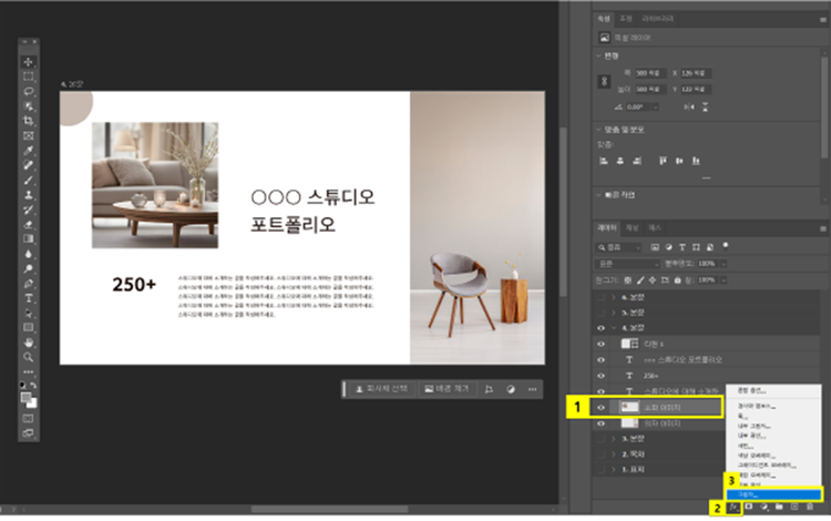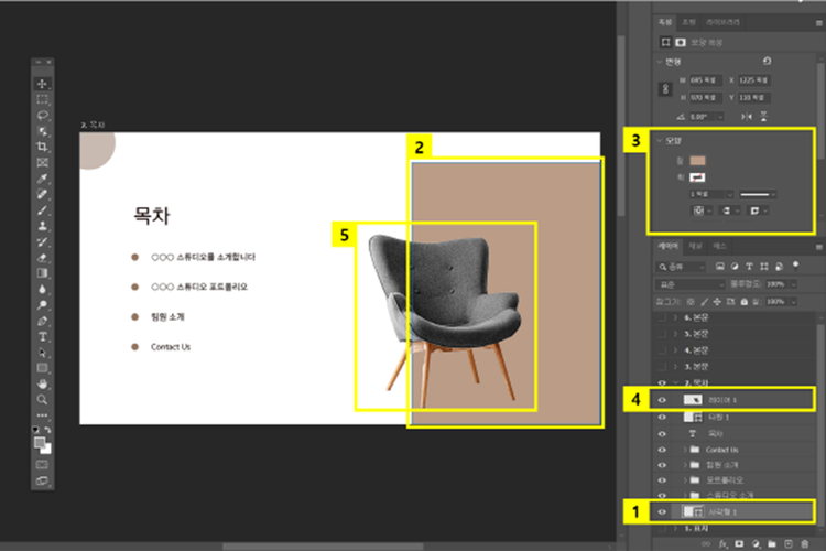 - 만들어진 [사각형 1] 레이어를 [의자 이미지] 레이어 순서 뒤로 보내기
