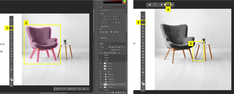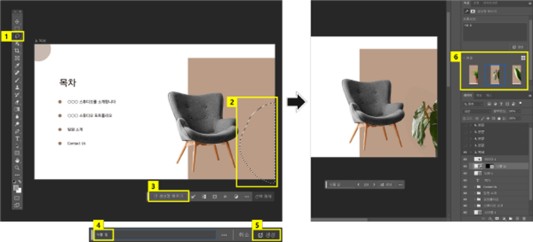 의자를 배치한 후, 우측 빈 영역에 의자와 어울리는 초록색 식물 오브젝트를 추가해보겠습니다. 포토샵 AI 기능인 ‘생성형 채우기’를 이용하면 배경이 없는 식물 이미지를 바로 삽입할 수 있습니다.