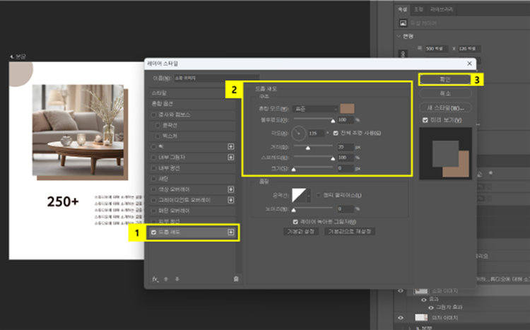 - ‘레이어 스타일’ 창에서 ‘드롭 섀도’ 활성화