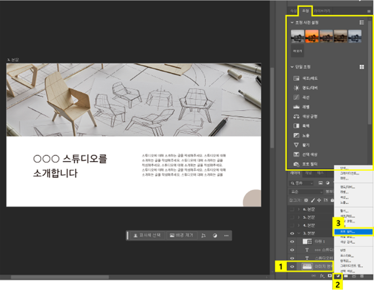 파워포인트 템플릿 내 이미지의 색상이나 밝기가 만족스럽지 않을 때 '조정 레이어'를 활용해보세요. 특히 '포토 필터'를 사용하면 이미지의 전체 분위기를 손쉽게 변화시킬 수 있습니다.