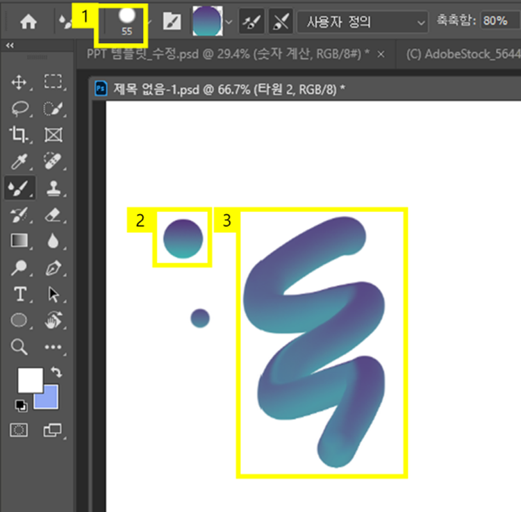 사용할 브러시 크기와 색상까지 복사하고 나면 아까 선택했던 예쁜 그라데이션을 가진 혼합 브러시가 탄생합니다. 이 브러시를 사용하여 Hello 필기체를 따라 글씨를 제작해보도록 하겠습니다.