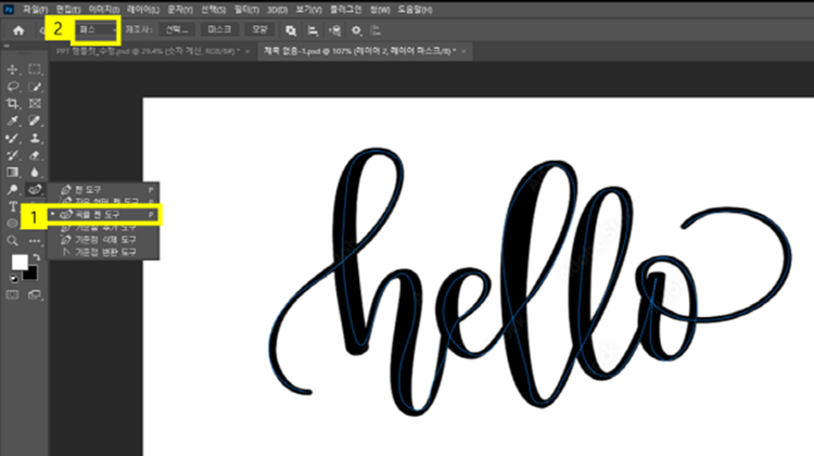 - [레이어 2]에서 ‘펜 도구’ 선택 ‘패스 획’ 클릭