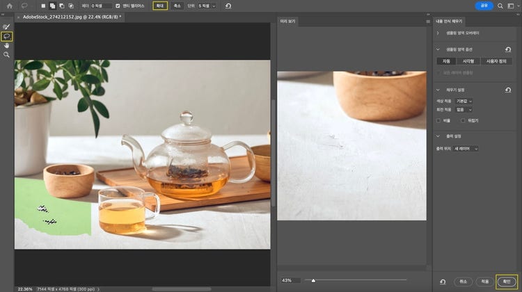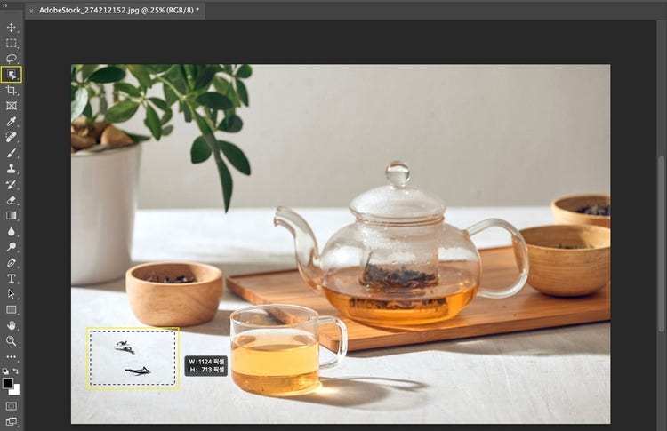이럴 때, 개체 선택 도구로 제거하고 싶은 영역을 선택해 사진을 수정해 보세요. 아래 이미지에서는 바닥에 떨어진 찻잎을 선택해 보겠습니다.