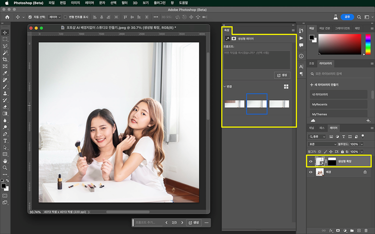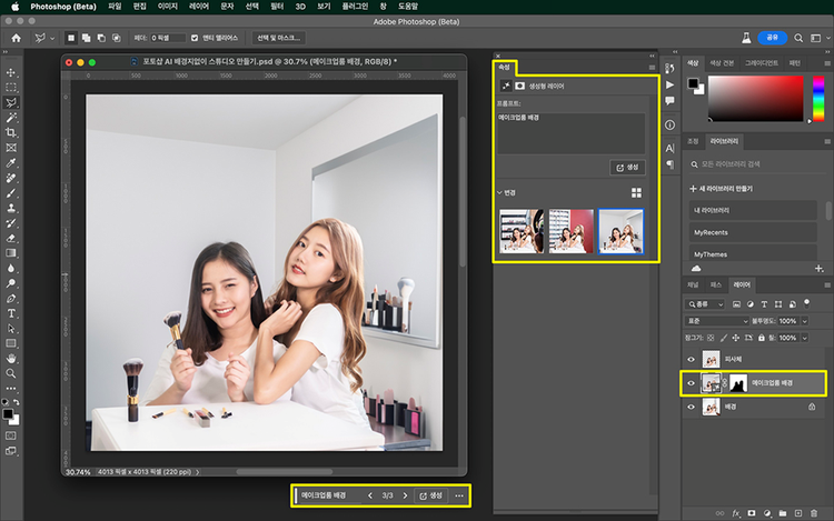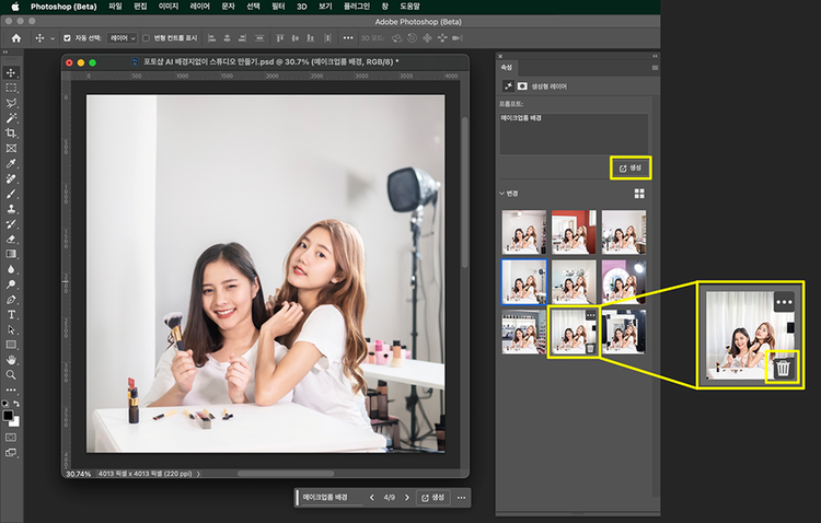 - 바의 생성형 채우기를 클릭, 프롬프트에 ‘메이크업 룸 배경’이라고 입력하기