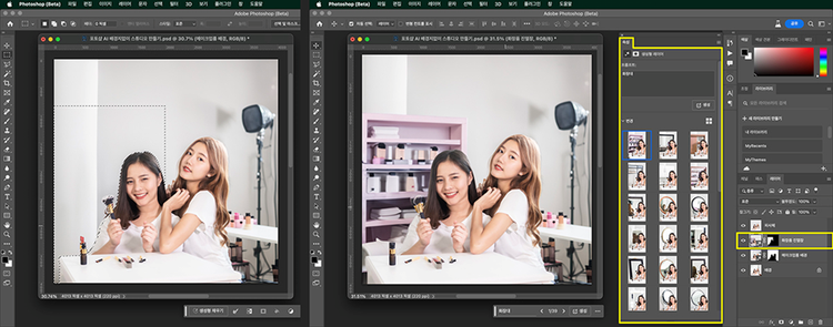 포토샵 AI 기능으로 특정 부분에 선택영역을 만들고 생성형 채우기를 활용하여 스튜디오처럼 소품이나 인테리어 장식 등으로 배경을 더 꾸밀 수도 있습니다. 촬영 주제에 맞는 아이템을 보강하여 보다 크리에이티브한 결과물을 만들 수 있죠.
