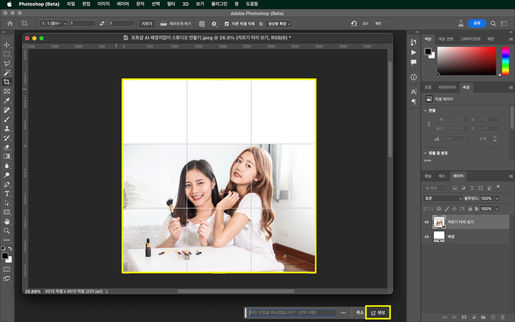 ‘자르기 도구’의 생성형 확장을 이용하면 사용 목적에 맞는 비율로 사진을 변경하고 크기를 확대할 수 있습니다. 캔버스 크기를 키우고 선택 영역을 만들고 ‘칠’로 채우기를 하던 방법을 AI 기반의 기술을 활용해 간편하게 작업할 수 있게 된 것입니다.