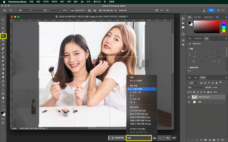 - 바에서 생성형 확장 버튼 옆 비율을 클릭하여 원하는 비율을 선택하기
