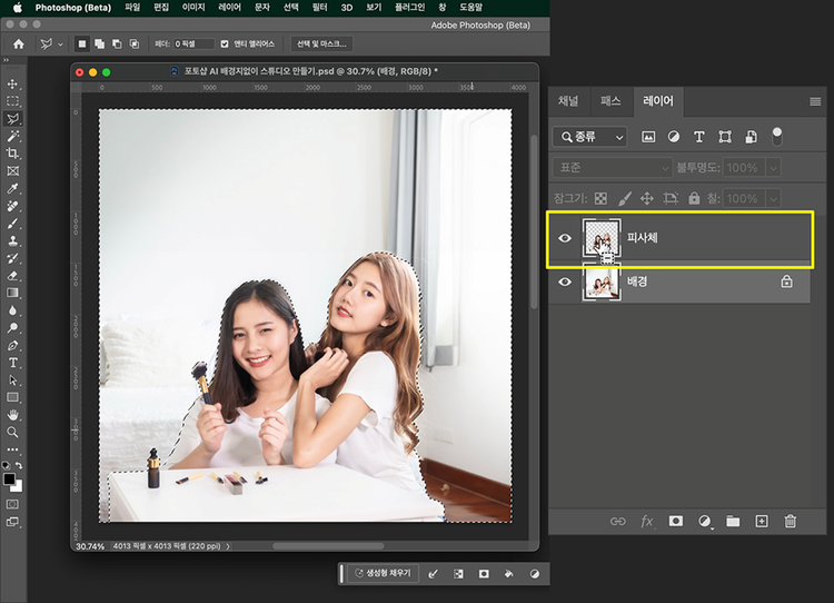 배경 합성 작업을 원활하게 하기 위해 먼저 배경과 피사체 레이어를 분리하는 작업부터 해보겠습니다. 피사체 레이어를 별도로 만들어 놓으면 배경만 선택하여 작업을 하는데 잘 활용할 수 있습니다.