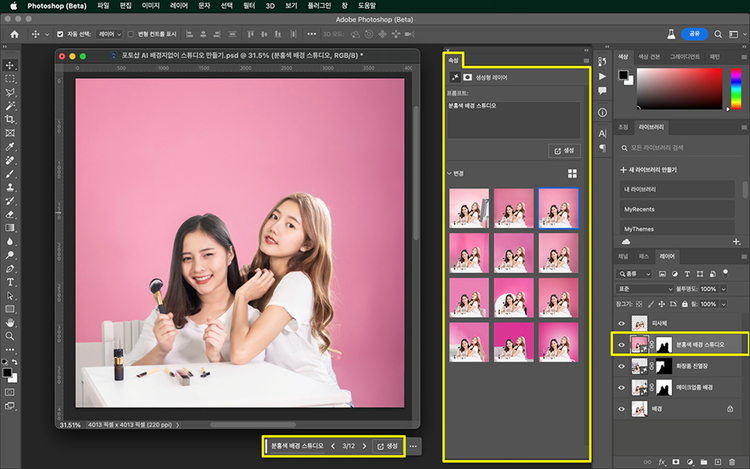 위의 작업에서 했던 것처럼 전체에서 피사체를 제외하여 배경을 선택 영역을 만듭니다. 그리고 생성형 채우기 프롬프트에 ‘분홍색 배경 스튜디오’라고 입력하였습니다. 생성 버튼을 반복 클릭하여 보다 여러 변형을 생성하고 자연스러운 이미지를 선택 적용합니다.
