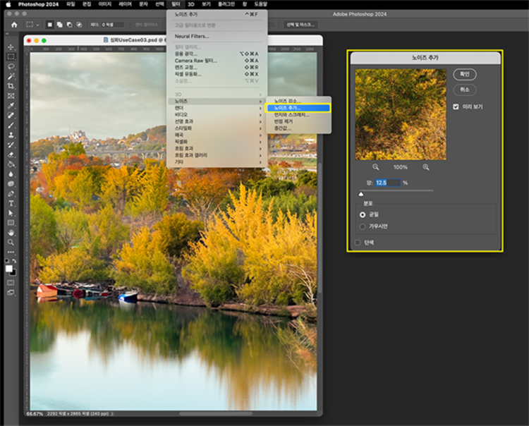 - ‘메뉴 창’에서 ‘필터 > 노이즈 > 노이즈 추가’ 선택 후 적절한 노이즈 값 부여