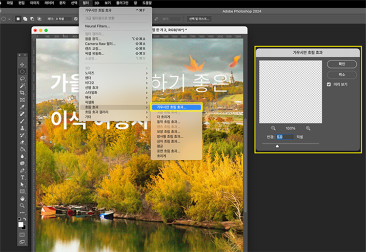 - ‘필터 > 흐림효과 > 가우시안 흐림효과’ 선택 후 적절한 필터 값 부여