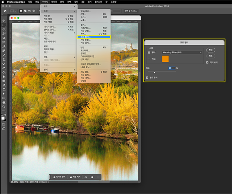 - ‘메뉴 창’에서 ‘이미지 > 조정 > 포토필터 > Warming Fliter’ 선택 후 적절한 필터 값 부여