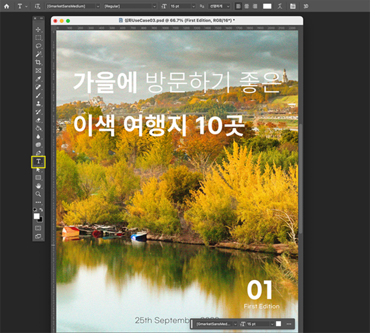 이제 제목이 잘 보일 수 있도록 문자 디자인이 필요합니다. 텍스트 도구를 활용하여 제목의 가독성을 고려해 굵고 큰 크기의 서체를 사용해 적절한 위치에 배치해보세요.