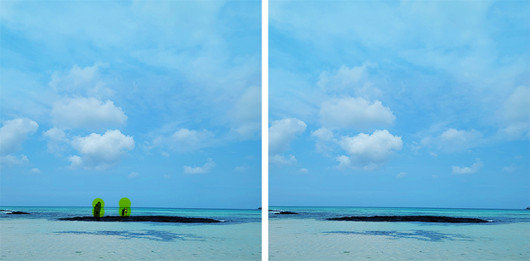 사진속에 사람은 지우고 배경만 남기고 싶다면 스팟 복구 브러시 도구를 이용하면 주변의 배경을 인식하여 자연스럽게 사람은 지워지고 배경으로 채워집니다.