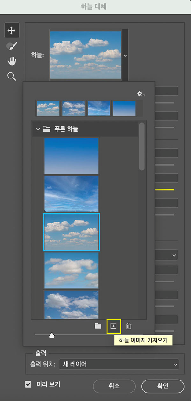 - 하늘 대체 대화 상자에서 상단 하늘 사진 클릭하고, 원하는 하늘 선택하기