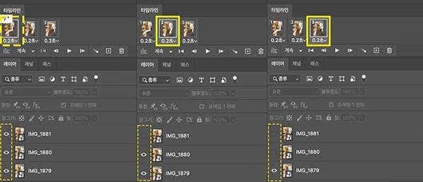 1. 타임라인 창의 프레임 선택 > 레이어 창에서 노출할 이미지 설정