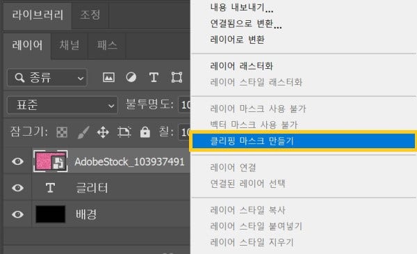 - 상단 메뉴 바 > 레이어 > ‘클리핑 마스크 만들기’ 클릭