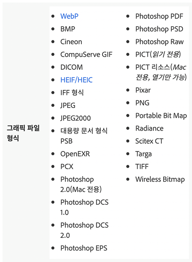포토샵은 JPEG, PNG, PSD 같은 기본 포맷은 물론 GIF, TIFF, HEIF/HEIC, PCX처럼 특수하거나 PCX, BMP같은 오래된 포맷까지 폭넓게 지원합니다. 덕분에 과거 자료나 스캔 이미지도 이미지 뷰어로 문제없이 불러와 편집할 수 있어 업무 활용도가 높죠. 어도비 포토샵에서 지원하는 그래픽 파일 형식은 다음과 같습니다.