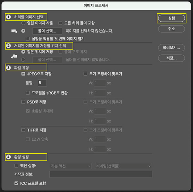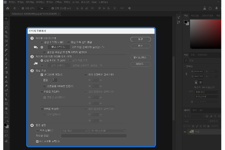 여러 장의 이미지를 하나하나 열어 수정하는 건 시간이 오래 걸립니다. 이럴 때 포토샵의 ‘이미지 프로세서(Image Processor)’ 기능을 사용하면, 여러 파일을 동시에 변환하고 크기를 조정하는 작업을 손쉽게 처리할 수 있습니다. JPG, PSD, TIFF 등 다양한 형식으로 한 번에 저장할 수 있고, 품질이나 크기를 미리 지정할 수 있어 대량 이미지 관리에도 유리하죠.